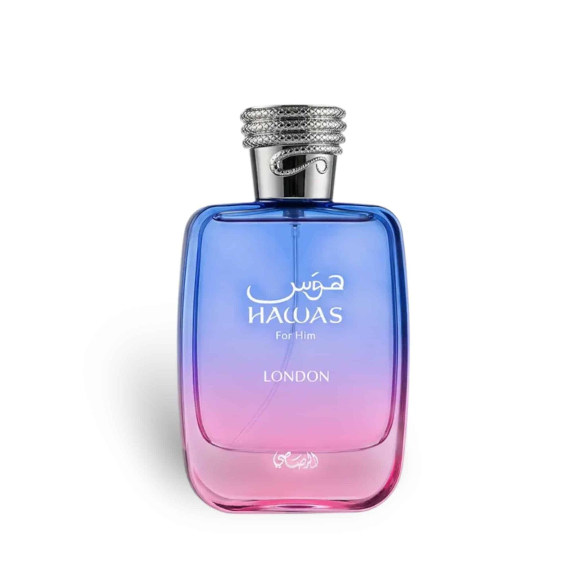 Hawas London by Rasasi is a modern composition built around a fresh, gently spicy opening and a warm, woody-amber base. It starts with a bright combination of pink pepper, pear, and saffron that gives a crisp, fruity and lightly spiced impression. The heart centers on rose, frankincense, and soft white florals, creating a clean, slightly creamy floral character with a subtle resinous accent. In the drydown, blond woods, vanilla, amber, and musk provide a smooth, warm foundation that feels polished yet not heavy, making the fragrance suitable for a range of settings from daytime wear to evening occasions.